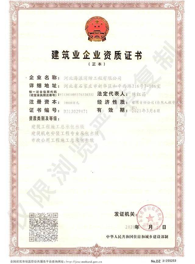 近日,河北海浪消防工程有限公司顺利通过了石家庄市行政审批局对企业资质申请的审查,成功新增建筑工程施工总承包三级资质、市政公用总承包三级资质。